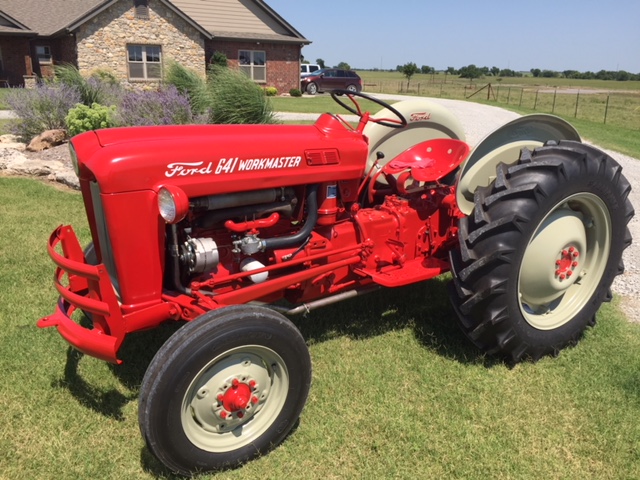 This is our latest pride and joy! This is a Ford 641 tractor. Jay's dad bought this brand new in 1959 and it is still in the family today. It needed a lot of work when I got it home from my brother so i had Steven Young (in Bartlesville, OK) completely go through the tractor and repaint to original. It is gorgeous and will not see much use at least for a few years. It is in our garage for viewing if you want to stop by for a cup of coffee and we can uncover it and talk about the good old days in the hay field with a 7' sickle mower. Thanks Steve for the bucket list item completed!