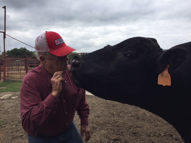 This picture is special to us as a family. The bull in this picture is of our past herd bull Ankonian Ayres 302. The gentleman is a retired veterinarian in the picture is a true, gentle man. That is Charlie Clinkenbeard of rural Bartlesville, OK. Charlie purchased "Alfred" this past spring from us to breed a set of commercial cows. Charlie and Alfred have a great relationship! It took Charlie a little time to realize that if Alfred saw him anywhere in the pasture or barn, here he would come sneaking up on Charlie to get a few pieces of cake or a rubbing around his ears and neck. Here is Alfred taking a piece of cake out of Charlie's mouth! They make a great pair and we are fortunate to see both of them frequently!